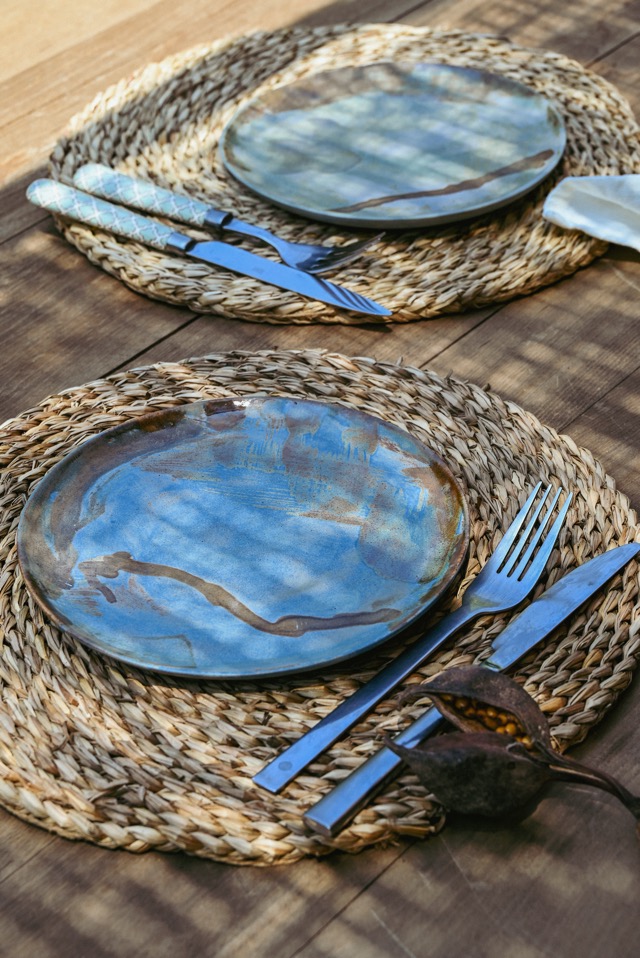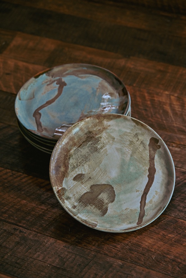 Set de 6 platos de autor hechos en cerámica gres, esmaltados en tonos grises y marrón.