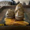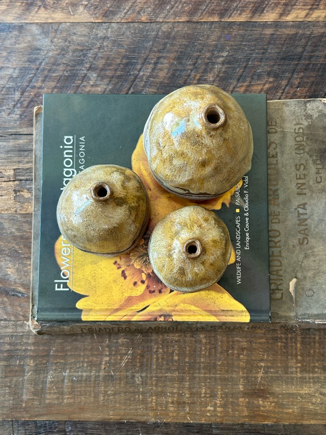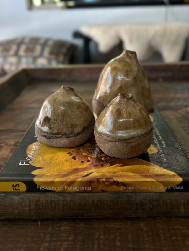 3 mini botellas decorativas de cerámica gres en tonos pardo. Medida 10,7 y 6 cm de alto.